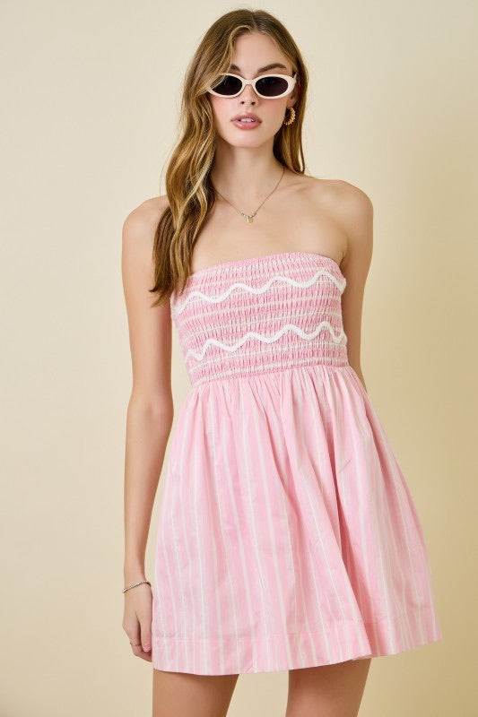 Striped smocked tube fit & flare dress with wavy trims
